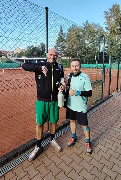 V Divizi Play Off A nám zbývá odehrát finále mezi Zdeňkem Peterem a Alešem Stachem. Finálové zápasy byly pozdrženy zraněním jednoho ze semifinalistů Davida Beneše, který měl úraz na kole. Vzhledem k tomu, že David je hráč, který dodržuje pravidla soutěže a je přínosem pro zápasy, tak jsme mu vyhověli s pozdržením jeho zápasů. David své semifinále i zápas o 3.místo nakonec prohrál (skončil na 4.místě), ale umožnil jeho soupeřům zahrát si kvalitní zápasy. Jak jsem již psal tak v zápase o 3.místo vyhrál soupeř Davida Beneše Pavel Pekárek 6:4 6:2 a chlapi poslali foto. David Beneš je vlevo a tenisový bojovník Pavel Pekárek vpravo. Oba hráči byli vždy přínosem pro naše turnaje a jsou součástí pevného jádra našich soutěží.